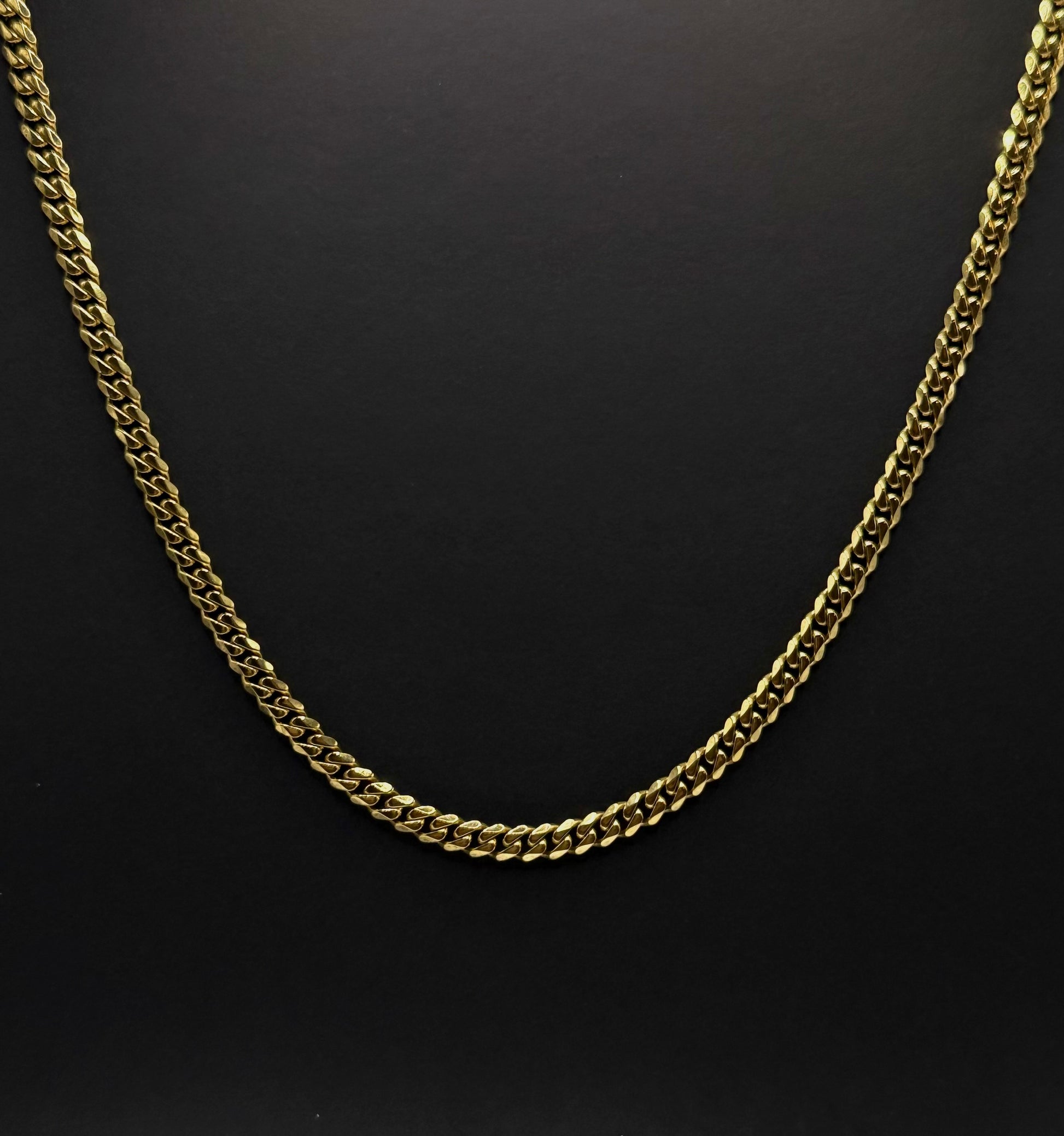 La cadena cubana de acero inoxidable con baño de oro de 14k es un accesorio audaz y elegante, elaborada con acero inoxidable duradero y recubierta con una capa de oro de 14k. Sus característicos eslabones cubanos entrelazados crean un diseño liso y plano que se adapta cómodamente al cuello, ofreciendo resistencia y un brillo lujoso. Resistente al deslustre y al uso diario, esta cadena combina una calidad duradera con un acabado dorado de primera calidad, lo que la hace perfecta tanto para el día a día como para ocasiones especiales. Ya sea sola o con un colgante, añade un toque de elegancia y modernidad a cualquier look.
